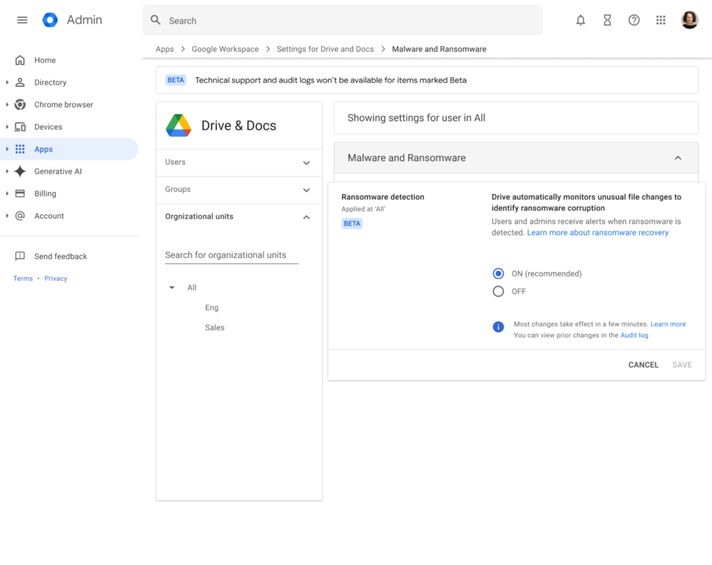 En septiembre de 2025 se lanzó en beta la detección de ransomware y restauración de archivos para Google Drive. Desde el 30 de marzo de 2026, estas dos funciones están disponibles de forma general, con mejoras significativas en la detección de malware. Ahora también se identifican más tipos de cifrado por ransomware y de forma más rápida que en la beta.